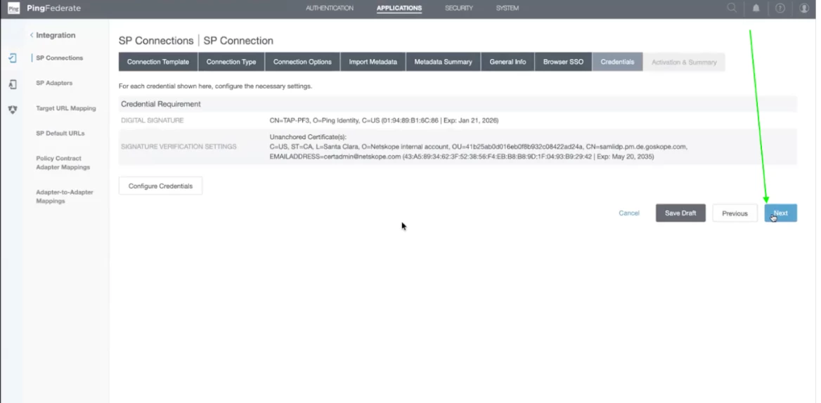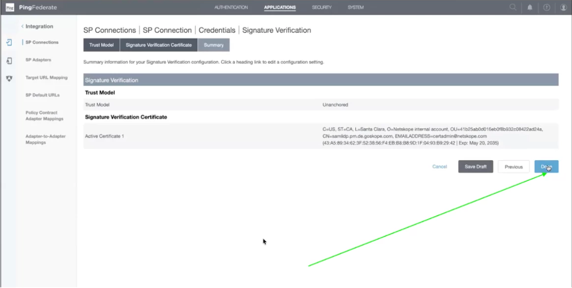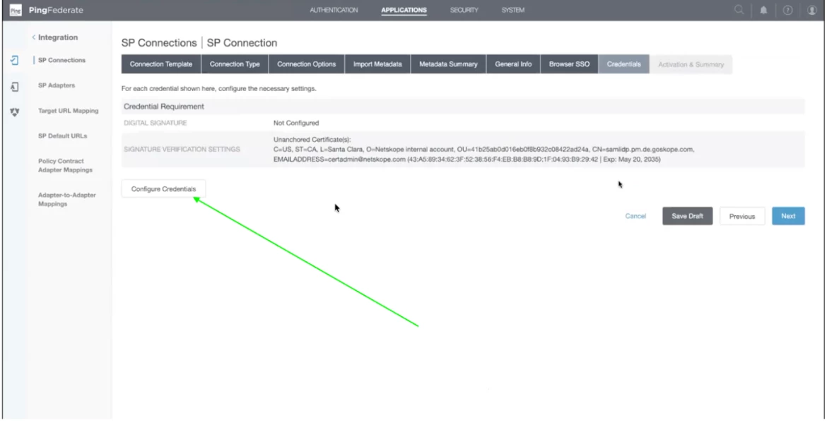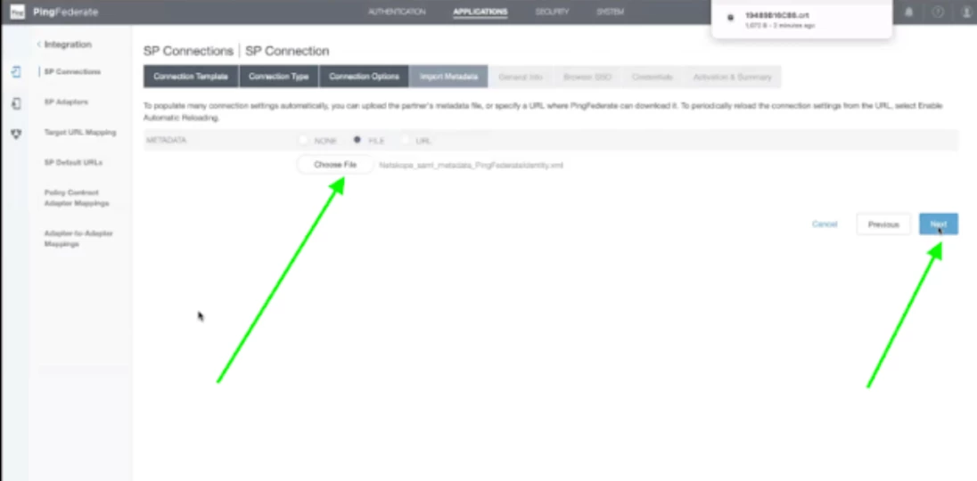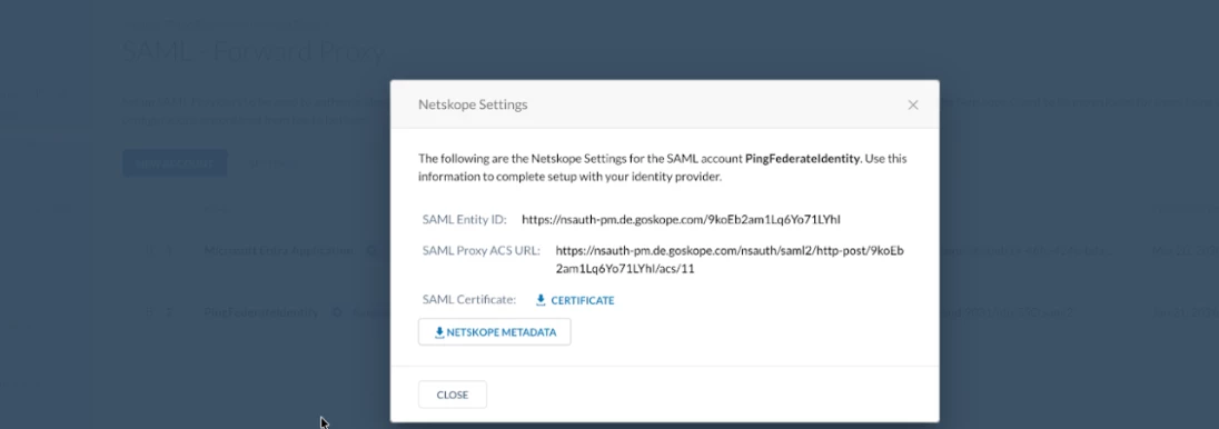 Step 16 - Download the metadata certificate from your netskope tenant. Once the certificate is downloaded, go back to the Ping tenant.