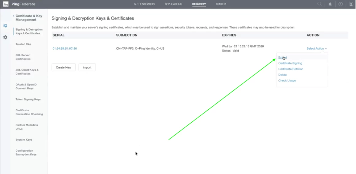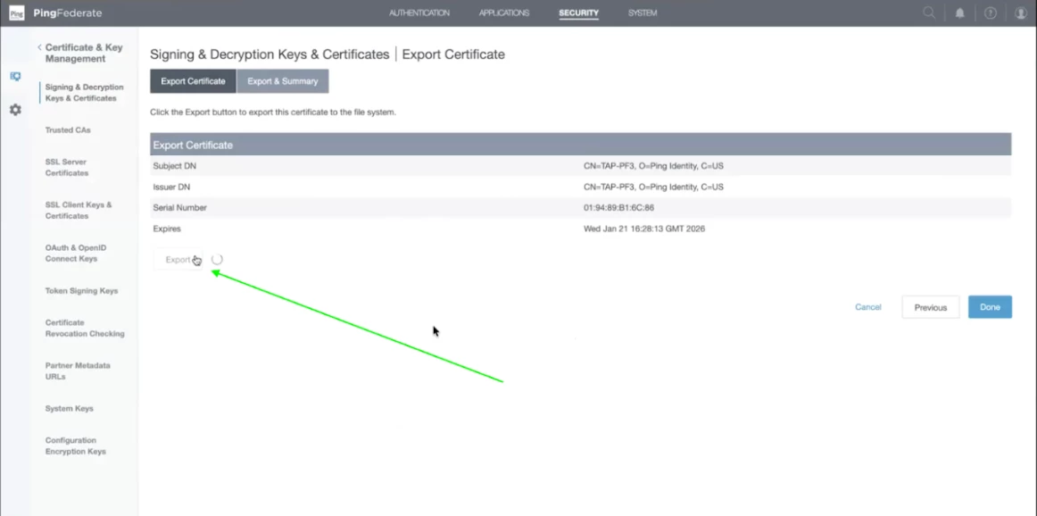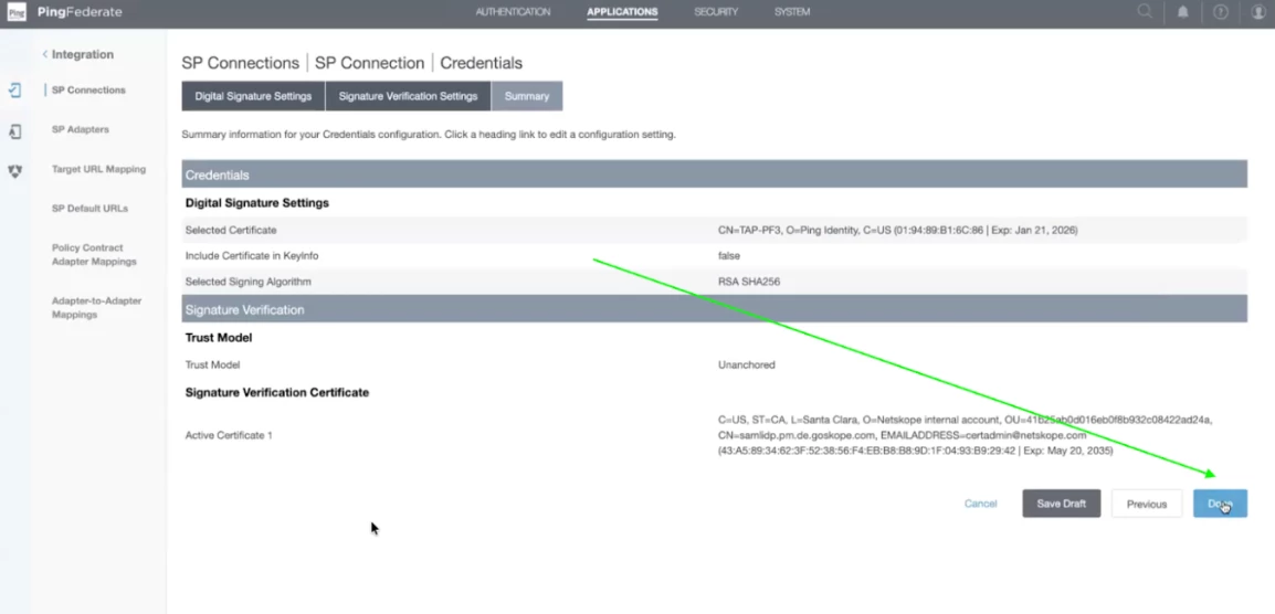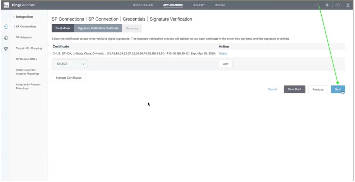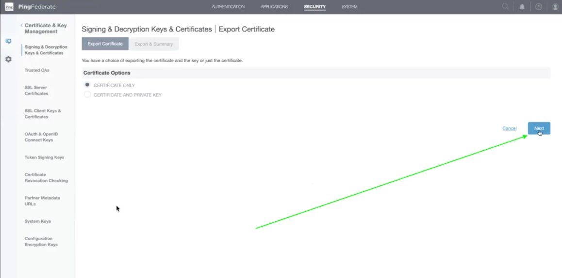 Step 16 - Download the metadata certificate from your netskope tenant. Once the certificate is downloaded, go back to the Ping tenant.