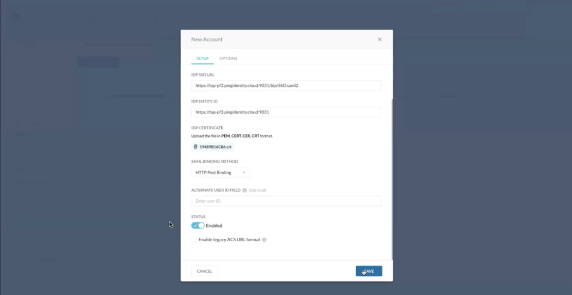 Enter SSO URL => https://tap-pf3.pingidentity.cloud:9999/idp/SSO.saml2