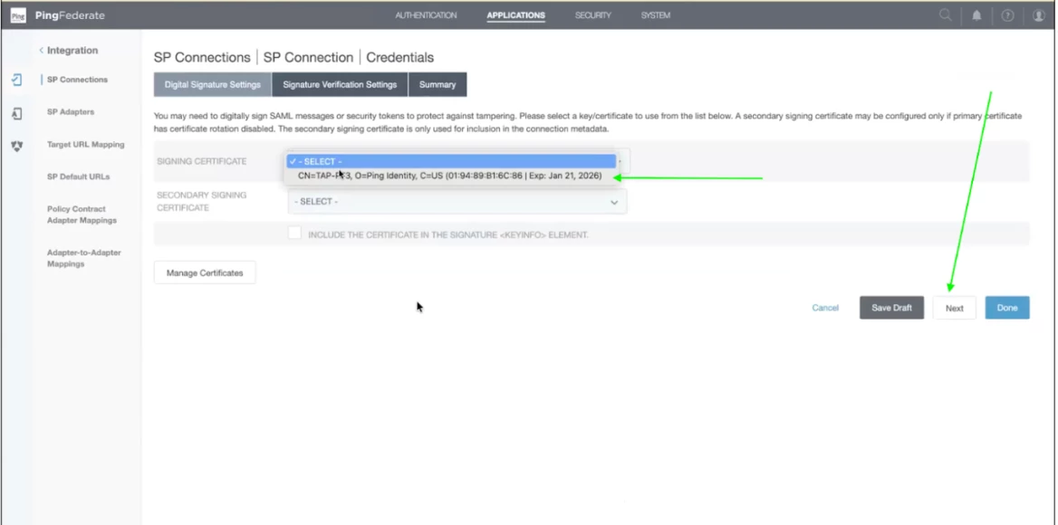 Step 49 - Now select the signing certificate from the dropdown. It will be auto populated. Leave the secondary signing certificate blank. After that click Next.