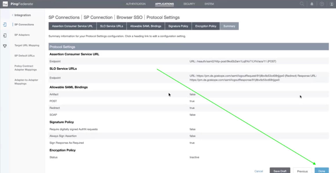 Step 57 - This is the final step which contains a summary of the configuration. Scroll down and click Save. You will receive the SSO Application Endpoint URL which you can use for loggin in to the SSO Profile.