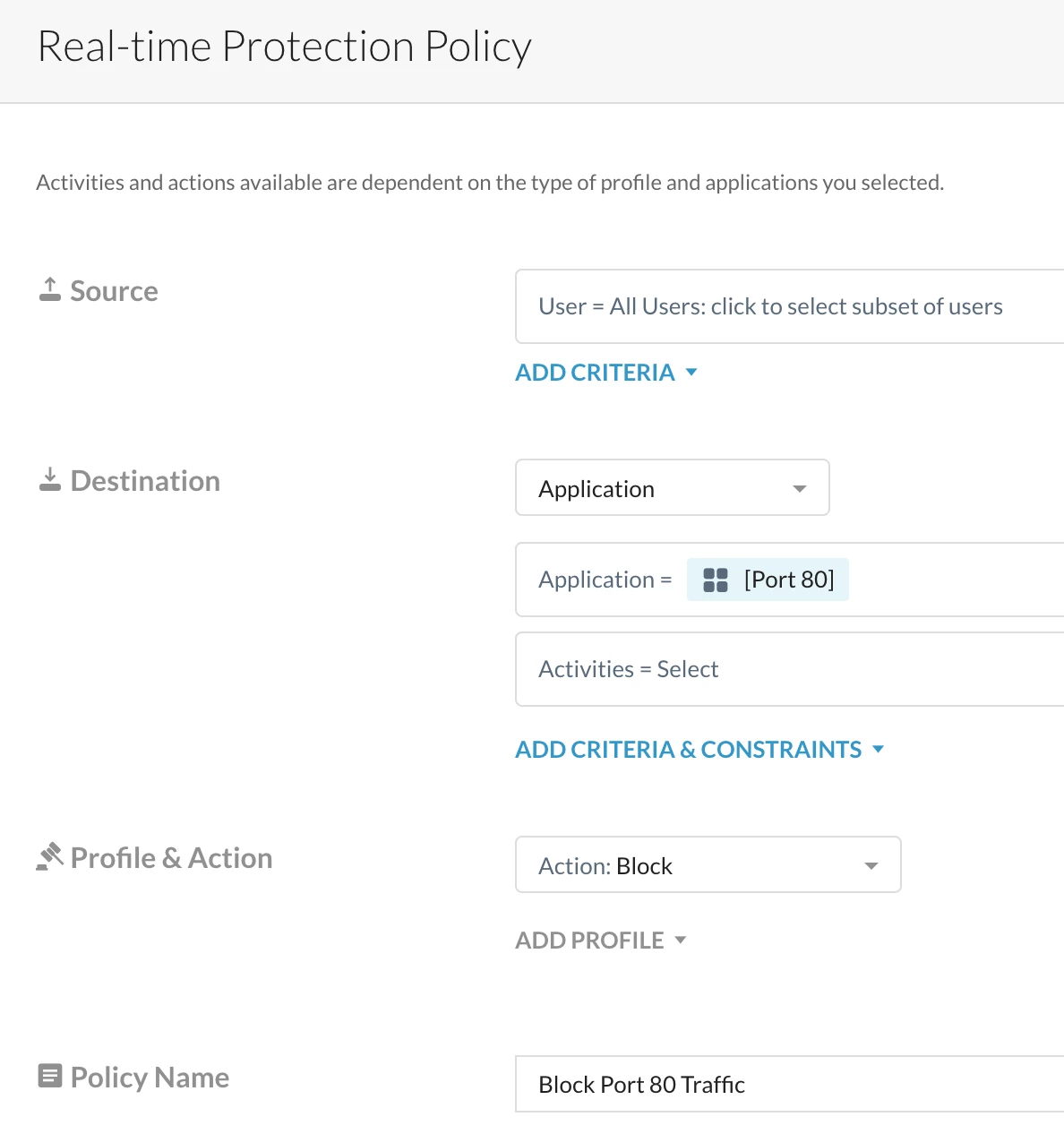 Follow the steps below to block port 80 traffic using Netskope Cloud Firewall (CFW).