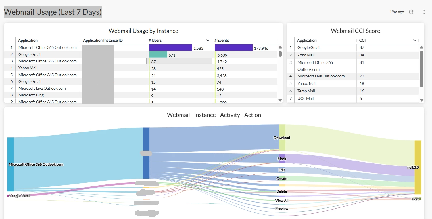 Report for viewing email applications and instances being used, risk score, activities, and applied policies.