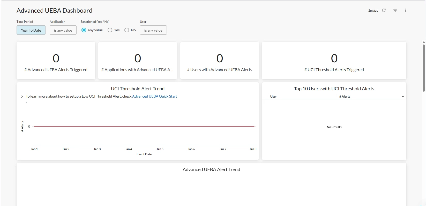 By default, the dashboard starts with a summary of Advanced UEBA alerts triggered in the last 30 days, including # alerts triggered, # apps with these alerts, and # users triggering these alerts. The # UCI Threshold Alerts triggered are highlighted, which is a starting point for your user investigation.