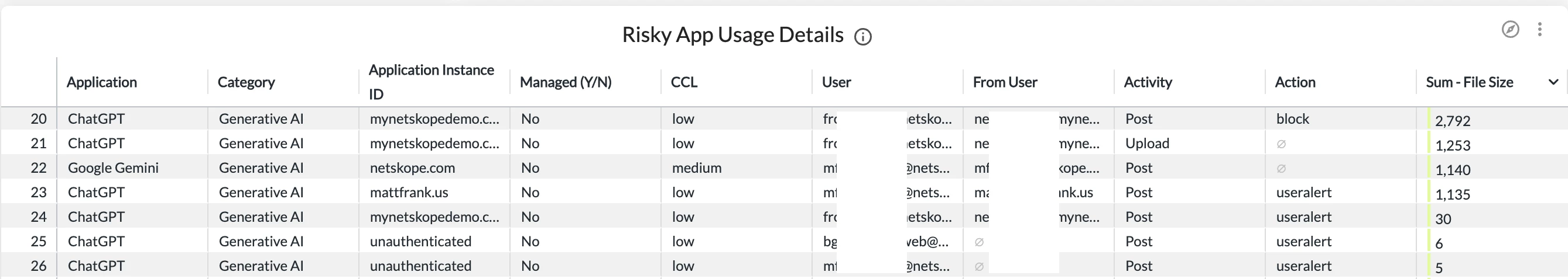 The dashboard starts with Unmanaged & Risky App Usage, which provides a great starting point for your investigations. You can leverage this section to understand: