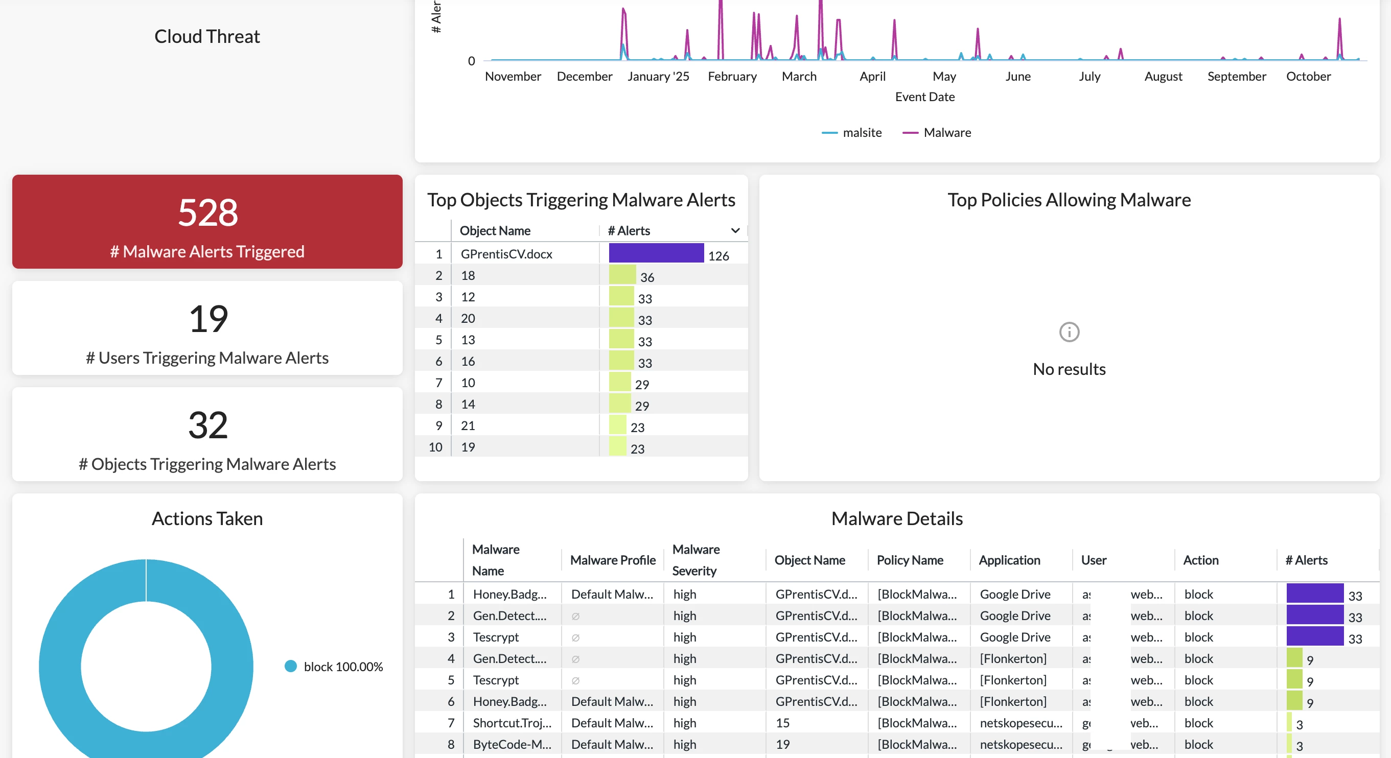 Use this part to monitor malware and malicious sites detected in Enterprise Browser and the corresponding threat protection policy actions. See policies allowing malware and malicious sites? Fine tune these policies, making sure they do not allow any malware or malicious sites to your environment.