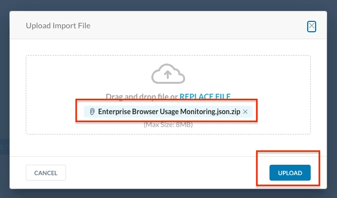 By adding the ZIP file we just downloaded to the window and hitting “UPLOAD,” the dashboard template will then be imported to Advanced Analytics on your own tenant.