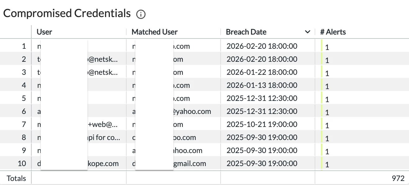 A: We recommend starting with the User Behavior Analytics (UBA) Dashboard in Netskope Library. The dashboard helps you monitor anomalous user behaviors in your environment by providing detailed visibility into different types of behavior analytics alerts, including compromised credentials.