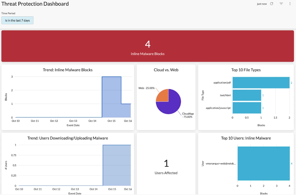 A: We recommend starting with the Alerts data collection since it provides explicit visibility into cyber attacks detected by your real-time protection policies such as malware, malicious sites, & compromised credentials. The Threat Protection Dashboard in Netskope Library is a great starting point.
