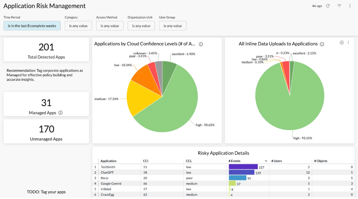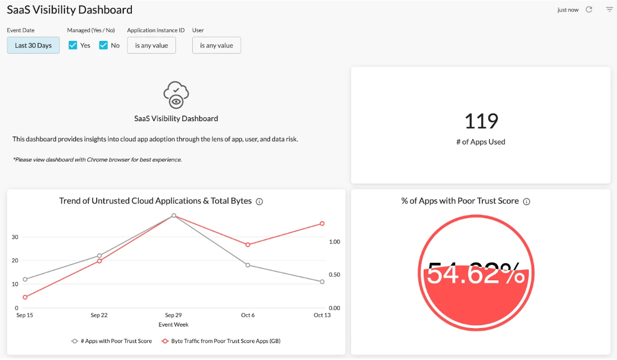 If you are looking to drill into suspicious/risky SaaS app usage, the Application Risk Management Dashboard is a great option. This dashboard helps you better understand: