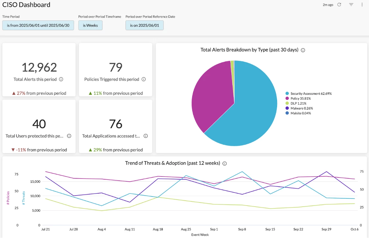 A: The CISO Dashboard in Netskope Library is a great option. This dashboard provides high-level visibility into security concerns in your environment, including overall policy violations, threat alerts, DLP alerts, blocked traffic, & risky app usage. The period-over-period comparison allows you to easily monitor how the alert data is changing week over week.