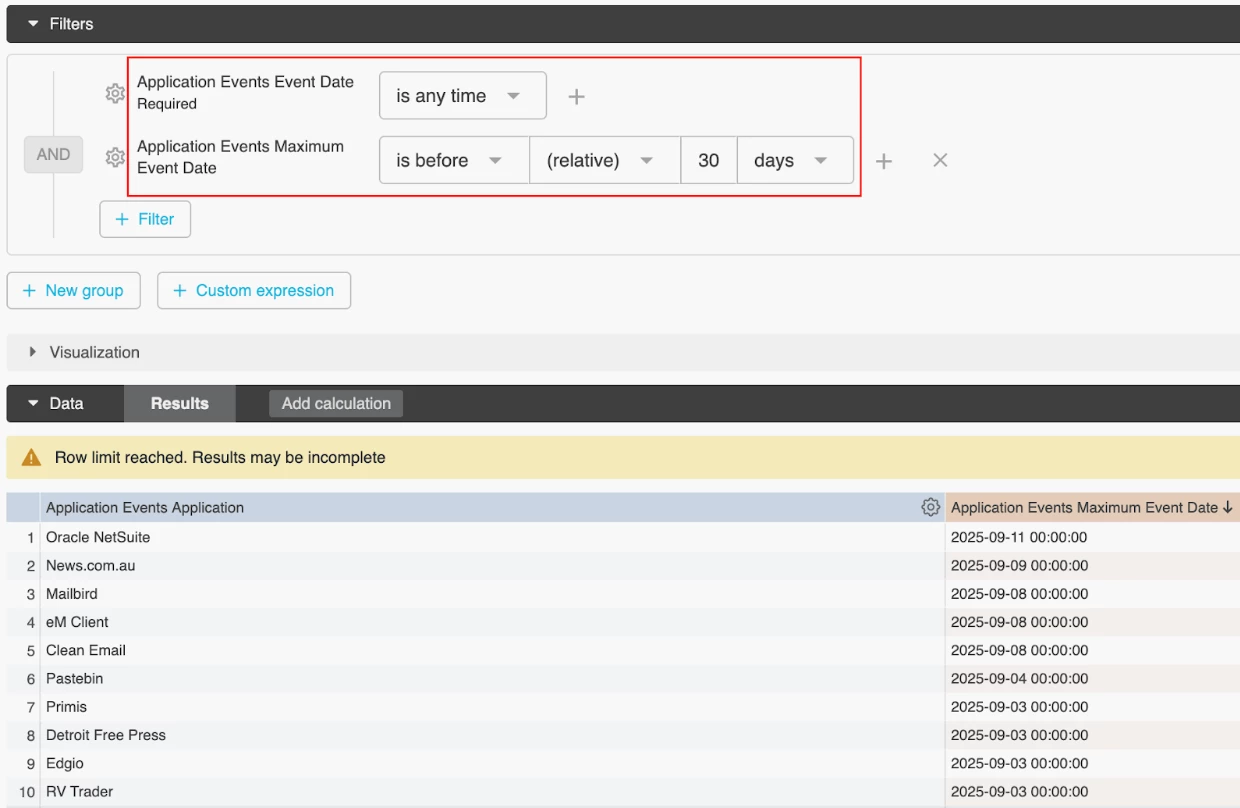A: Yes. Let’s start with a sample use case: “how to identify apps that were not used in the last 30 days?” The “Maximum Event Date” field can help. This field indicates the “last seen” date of each app detected. By applying this field as a filter “Maximum Event Date is before 30 days” (“last seen” date is before 30 days ago), apps that were not used in the last 30 days will be returned. Don’t forget to change the default “Event Date” filter to “is any time,” otherwise a query error will show up.