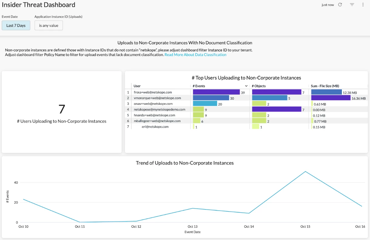 If you are looking for comprehensive visibility into risky user behaviors, the User/Organization Unit Investigation Dashboard will be a great option. This dashboard provides both high-level and detailed visibility into user activities from 3 dimensions: cloud app usage, DLP policy violations, & web traffic. Use this dashboard to identify and monitor suspicious/risky user activities, e.g. PCI files uploaded through non-corporate instances, in your environment.