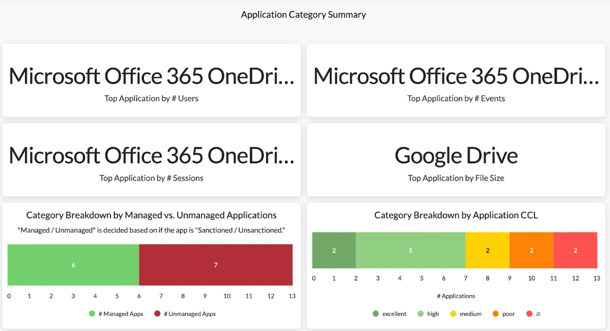 A: The Application Category Dashboard in Netskope Library is a good starting point. This dashboard provides detailed visibility into application usage by different categories in your environment, including: