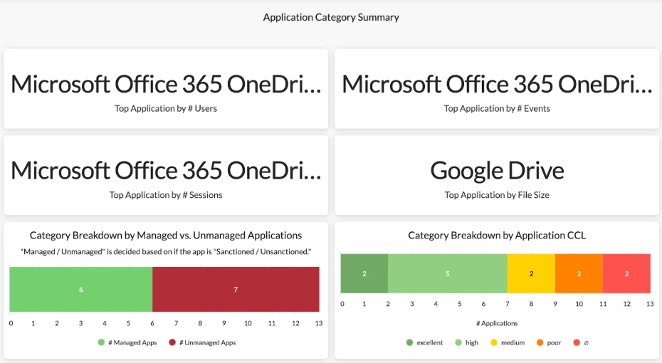 A: The Application Category Dashboard in Netskope Library is a good starting point. This dashboard provides detailed visibility into application usage by different categories in your environment, including: