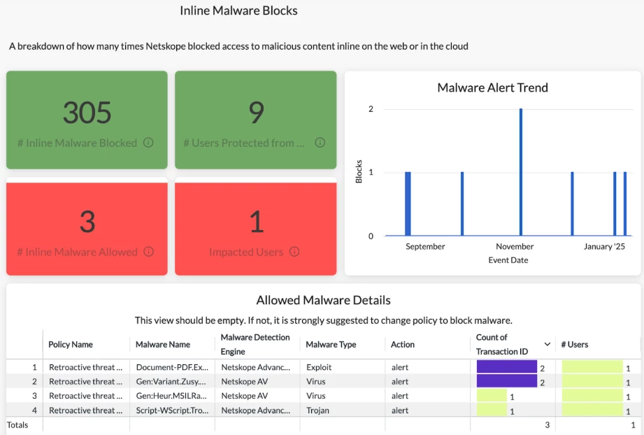 A typical use case with this dashboard is “to highlight change and demonstrate value.” For example, if you enhanced your threat protection by tuning your malware block policies and now want to see if the policies were working effectively in the past few months, the Inline Malware Blocks section of this dashboard will be a great option. It shows how the “blocked malware count” was changing over time, which highlights the value of the enhancement you have made to threat protection.