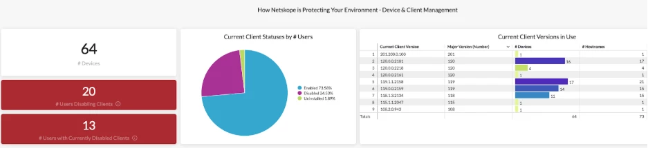 This is an all-in-one dashboard which allows you to perform self-service health checks and to identify security concerns / issues in your environment. The dashboard answers 2 questions: 1) How Netskope is protecting your environment; 2) What Netskope is protecting your environment from.