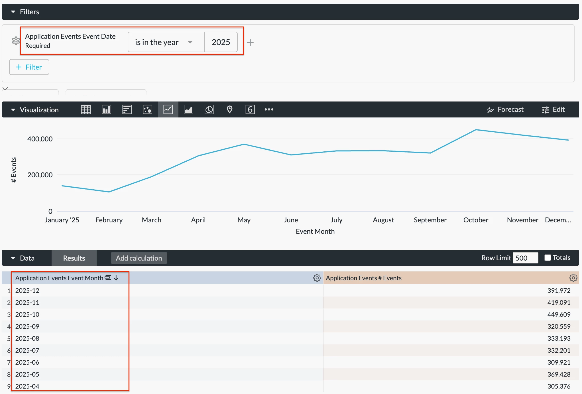 This condition sets an absolute timeframe to your data. For example, “is in the month February 2025” returns all data in Feb 2025.