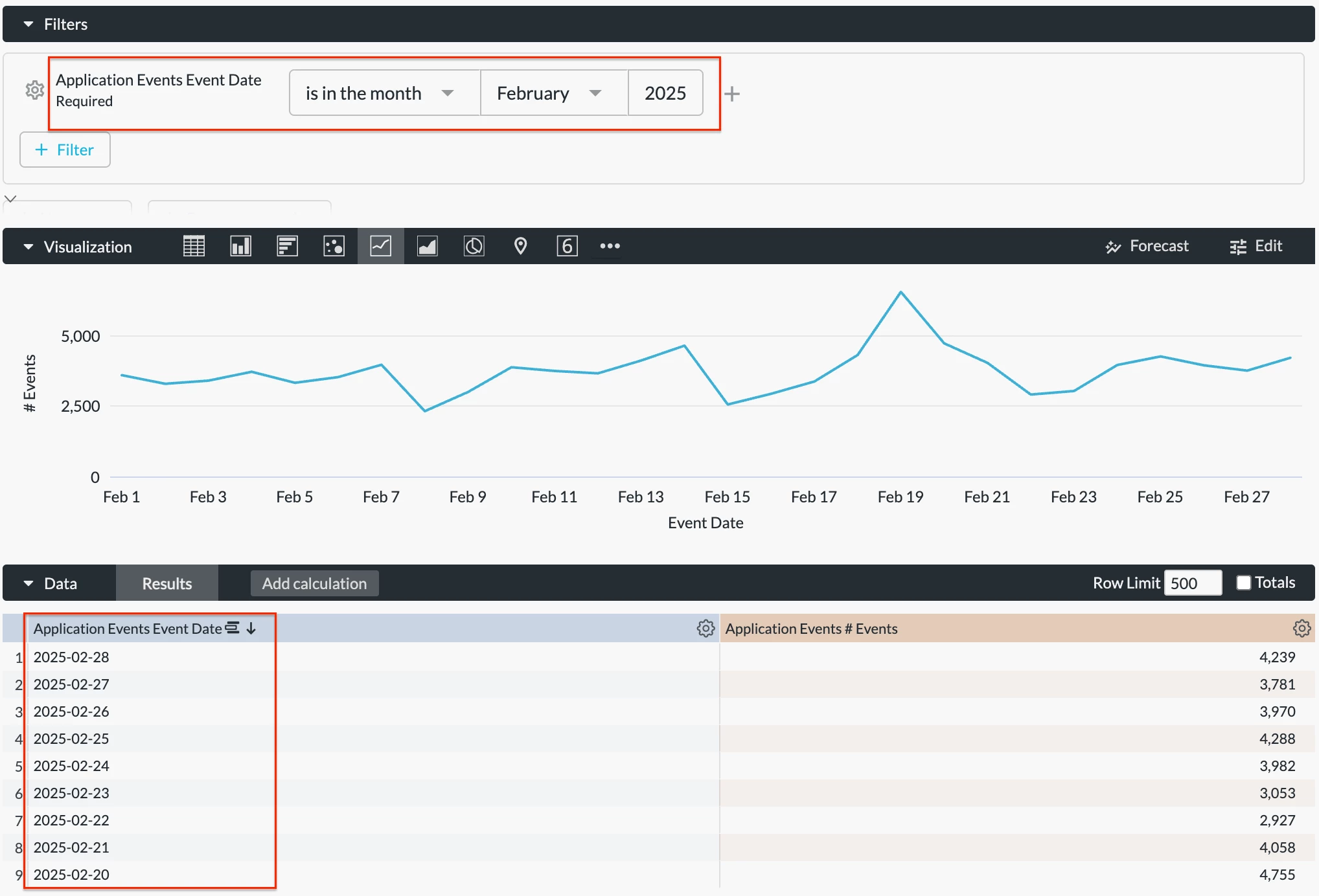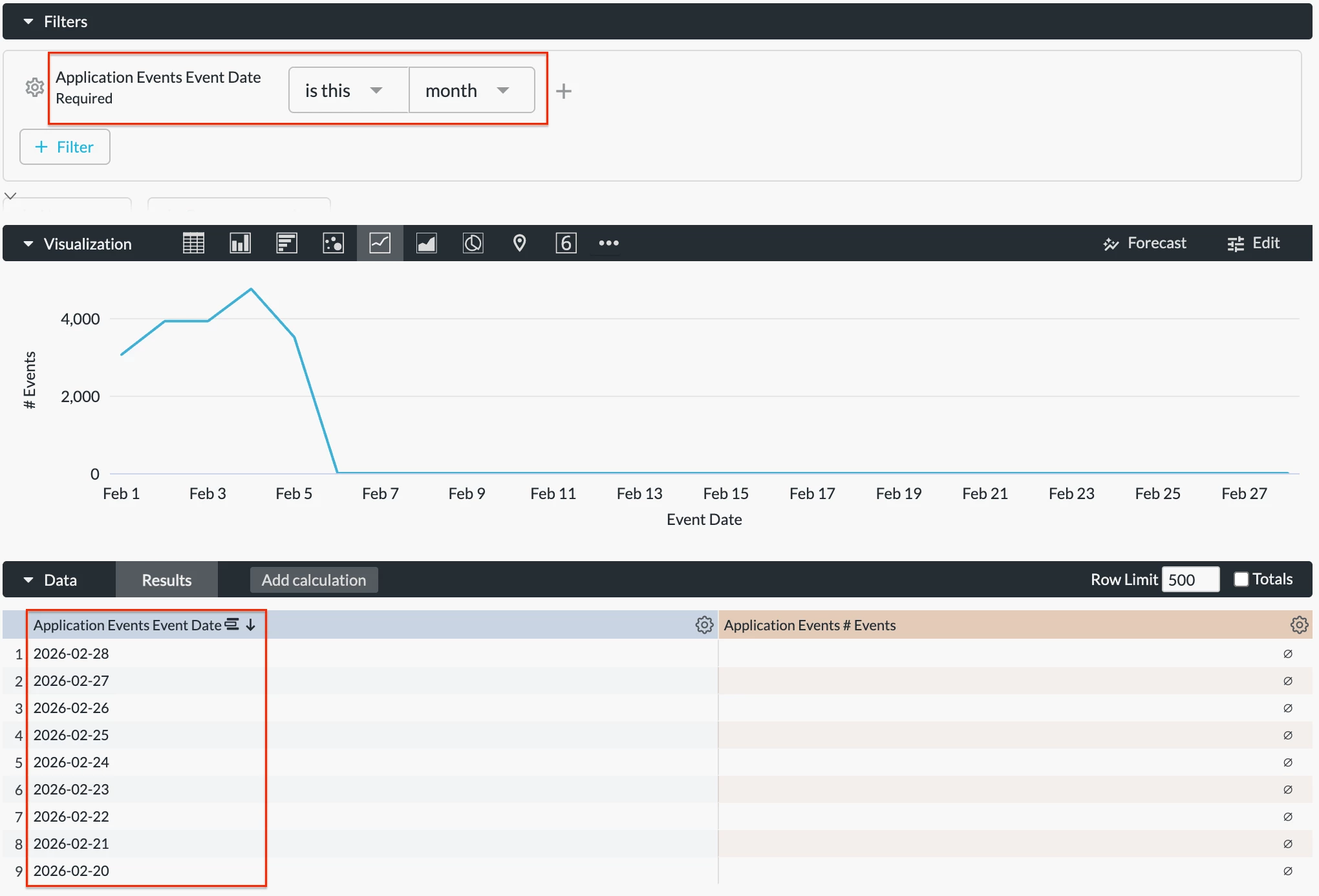 This condition returns all events with event dates not showing “null” data. In this case, event dates are reported and captured correctly.