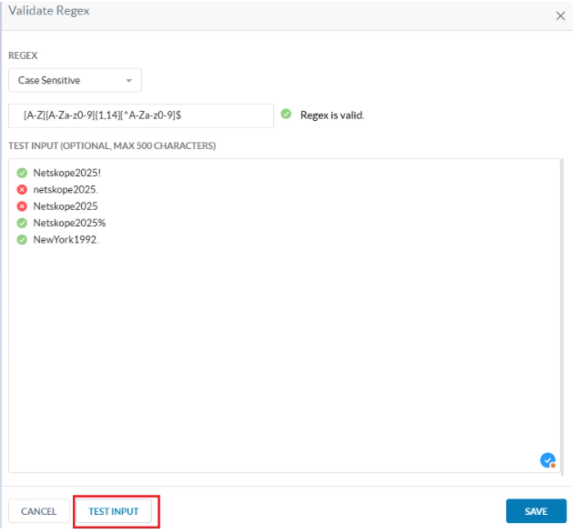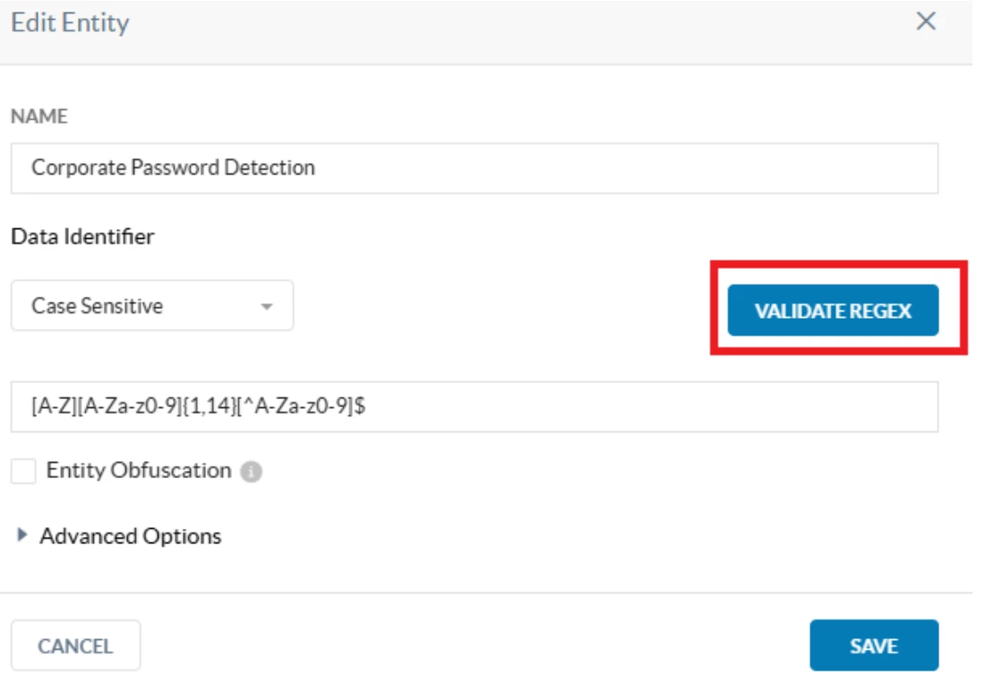 Add the regex expression created, set the data identifier as “Case Sensitive” and validate the regex.