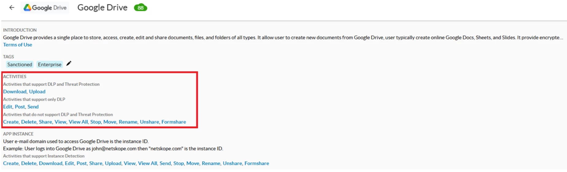 In this case Google Drive support DLP for Download, Upload, edit, post and send, other activities are not supported for DLP detection