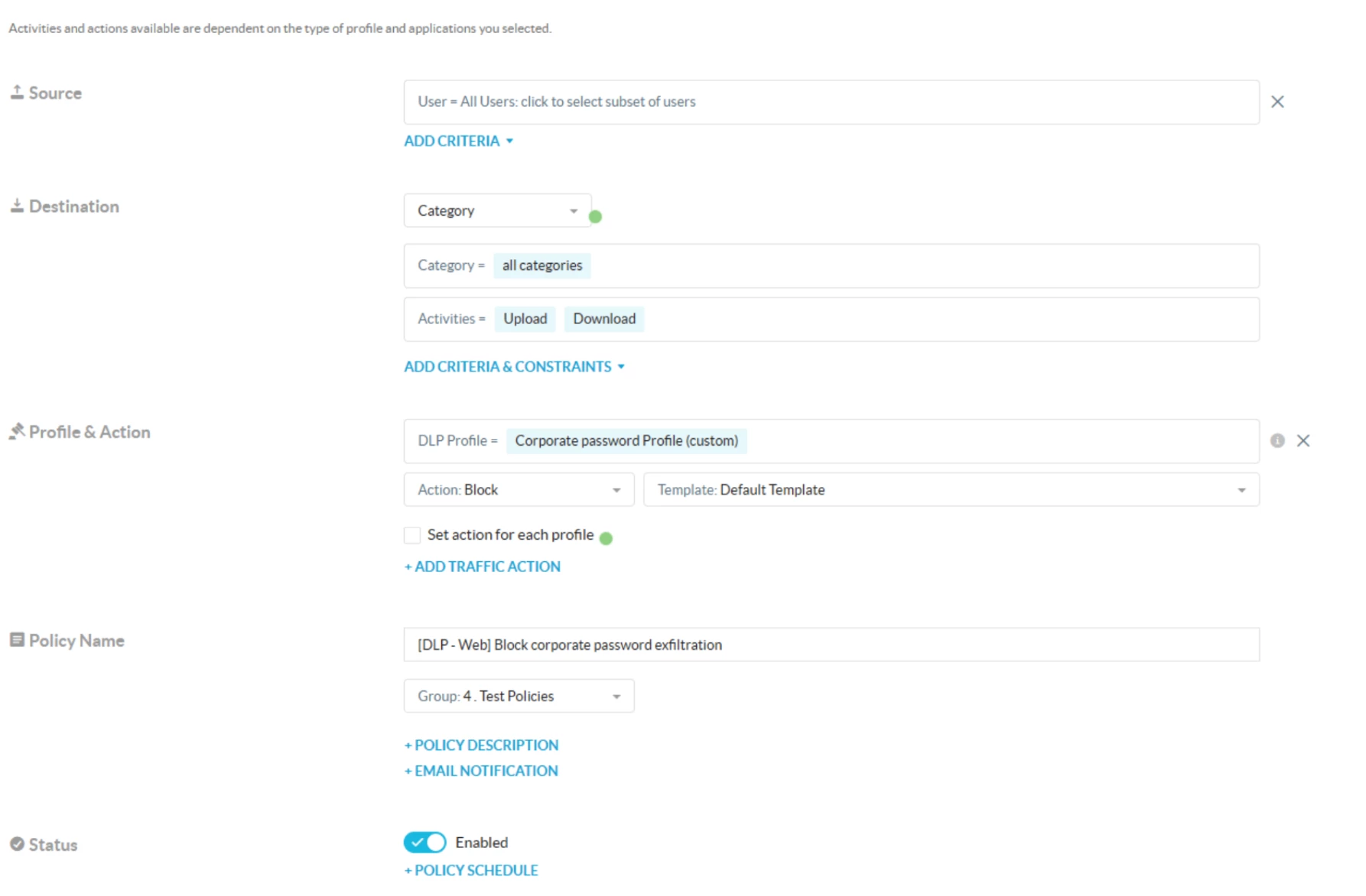 Note**: For web category–based policies, we recommend applying this rule to an upload related activity like post, share, send, publish, AI post, UploadAndSend, etc. For application-related policies, please refer to the App Catalog to review the activities that support DLP according to the connector.