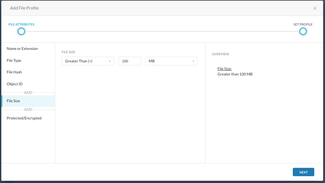 You can create file profiles for files greater than 100 MB.