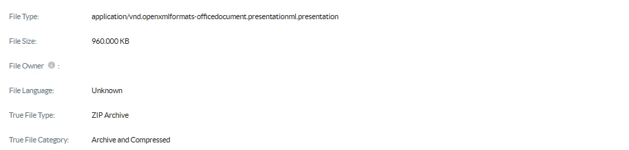 What I’ve noticed is that, for the blocked files, the “True file type” is detected as “ZIP archive.” In contrast, for files where the label is recognized and the upload is allowed, the “True file type” is shown as “Microsoft PowerPoint 2007 XML.”