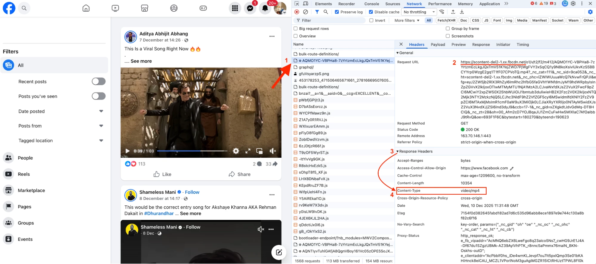 - In the above snapshot, a video is playing on the left. The Request URL is https://scontent-del2-1.xx.fbcdn.net and in the Response you can see that the