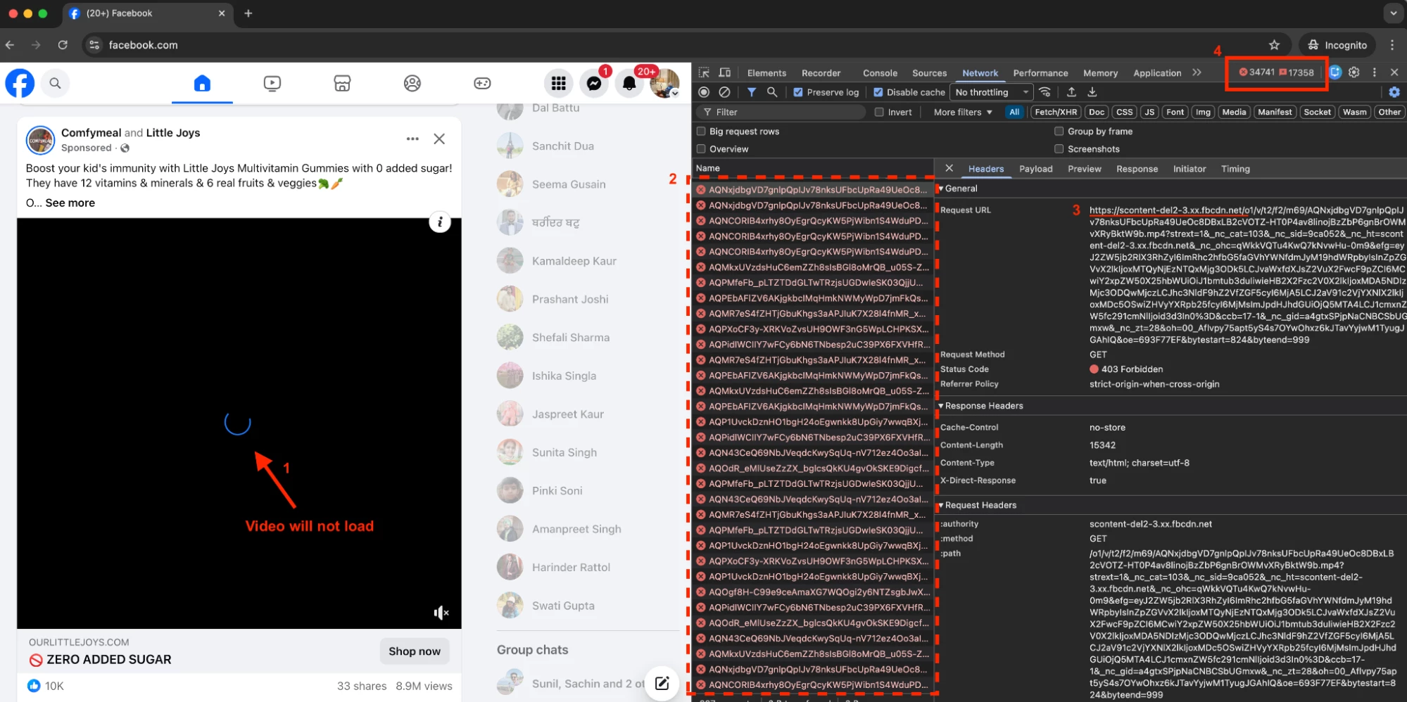 2 - Facebook will continue attempting to load the video through different CDN servers, but each attempt will receive a 403 response.