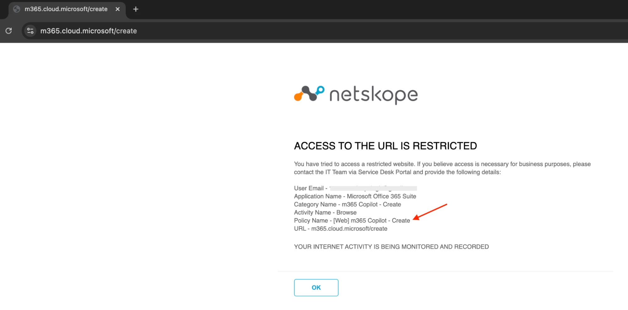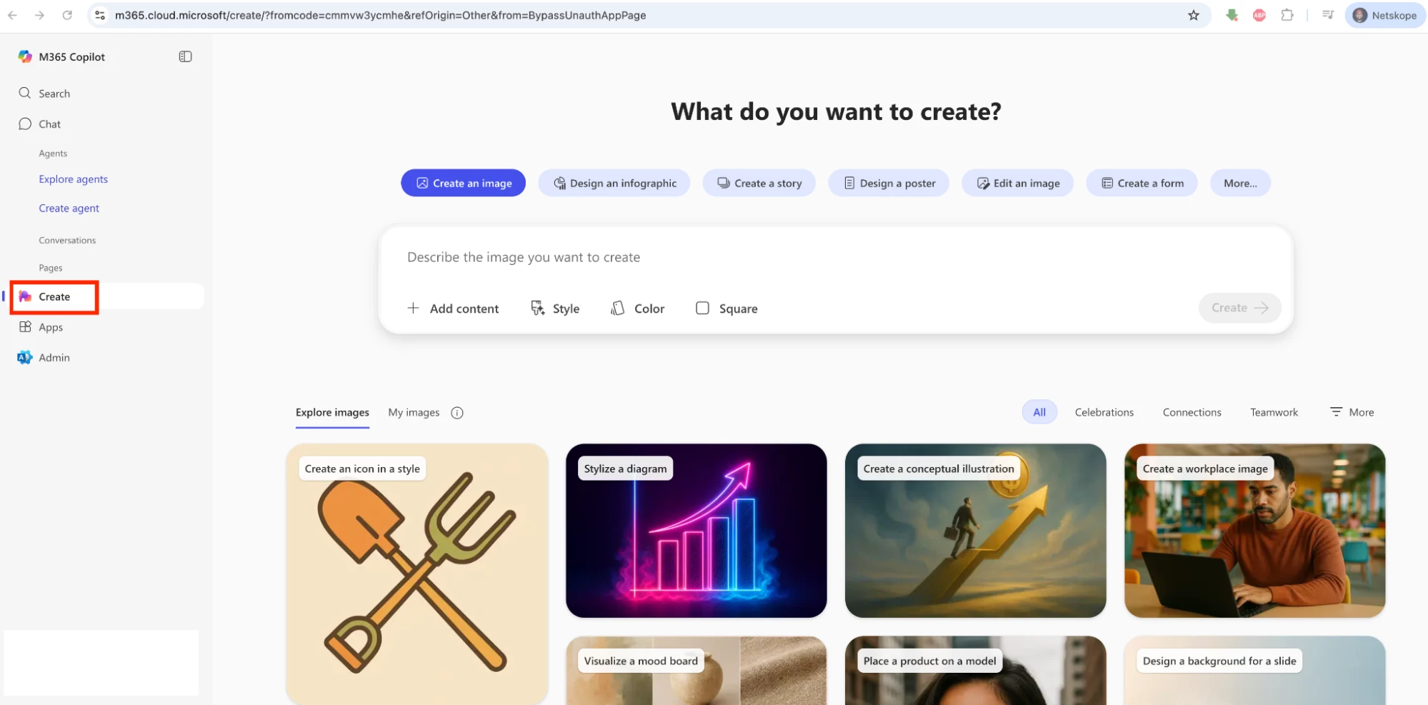 Microsoft m365 Copilot provides an inbuilt ‘Create’ function that can generate images, infographics, stories, and more. This functionality is separate from the Copilot chatbot engine. Customers may have a use case where they want to allow all Copilot services except the ‘Create’ feature. This KB article explains how to achieve this using Netskope.