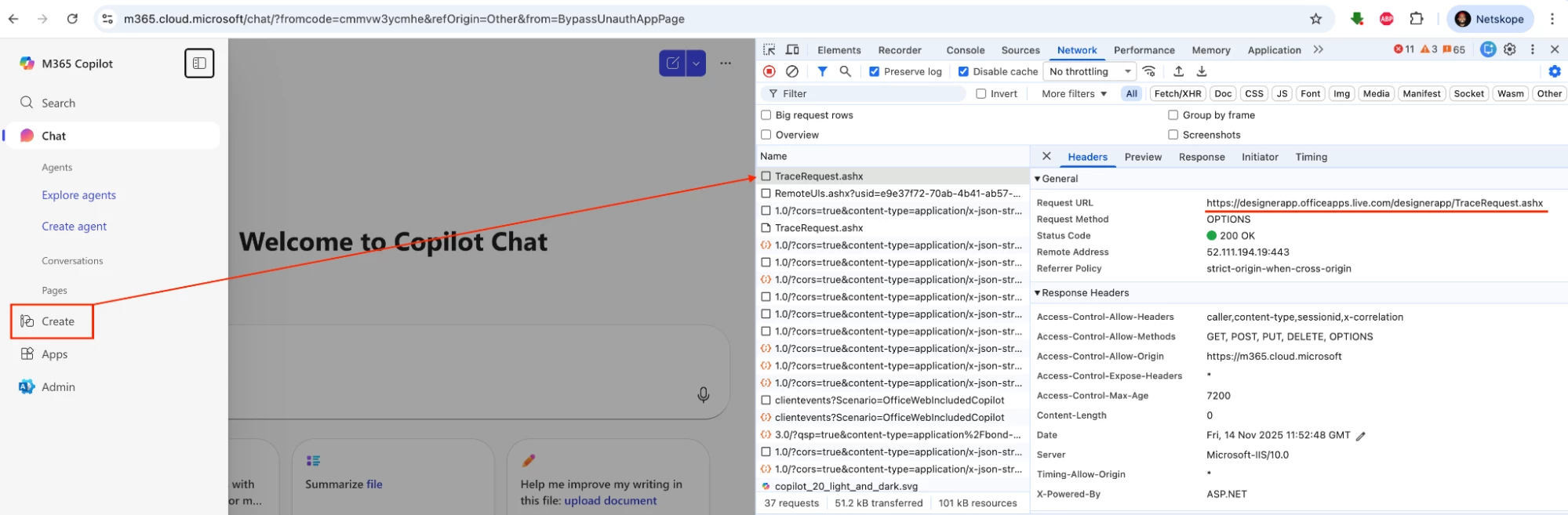 - When you first navigate to https://m365.cloud.microsoft/ and then click on ‘Create’ option, the traffic is redirected to https://m365.cloud.microsoft/create, and in the backend services from another URL https://designerapp.officeapps.live.com/designerapp/TraceRequest.ashx are invoked.