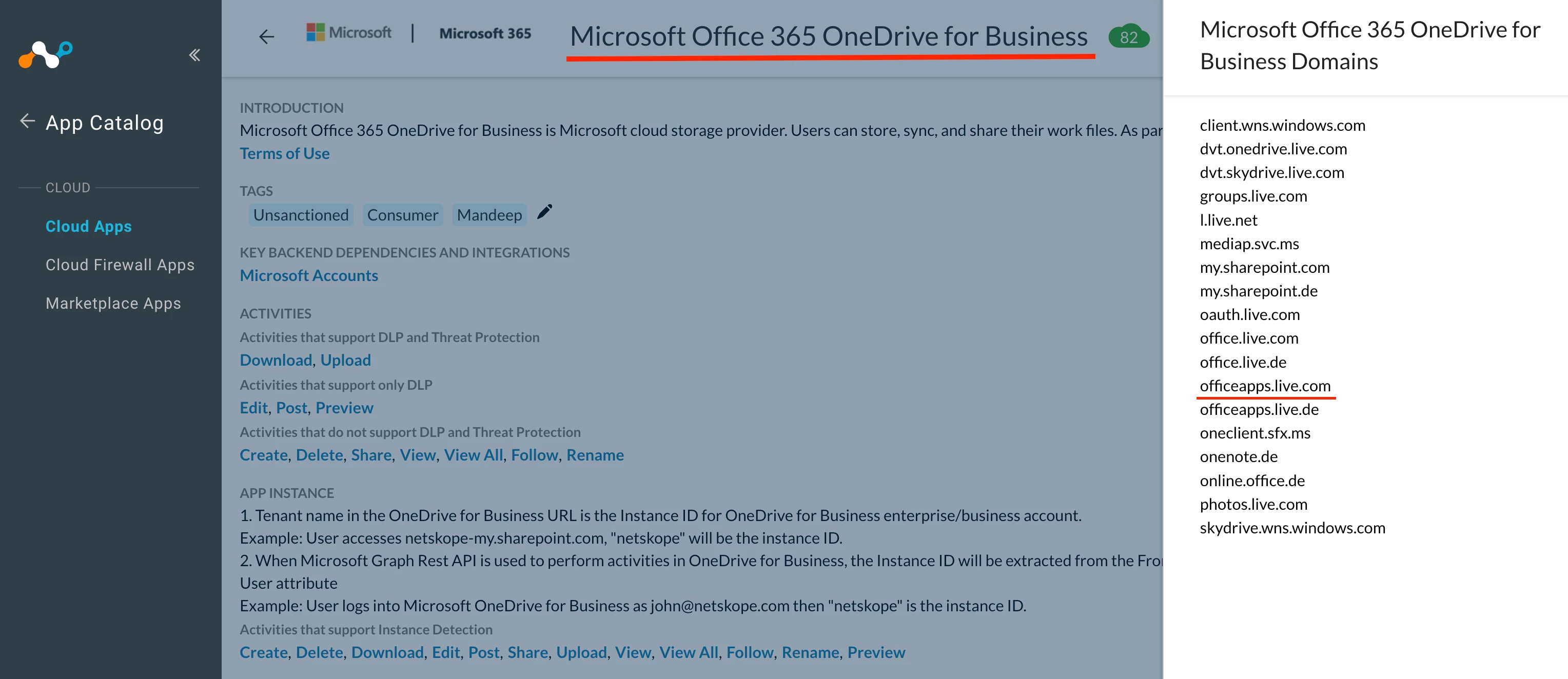 - The domain officeapps.live.com is mapped to Netskope’s predefined Cloud App connector for Microsoft Office 365 OneDrive for Business.