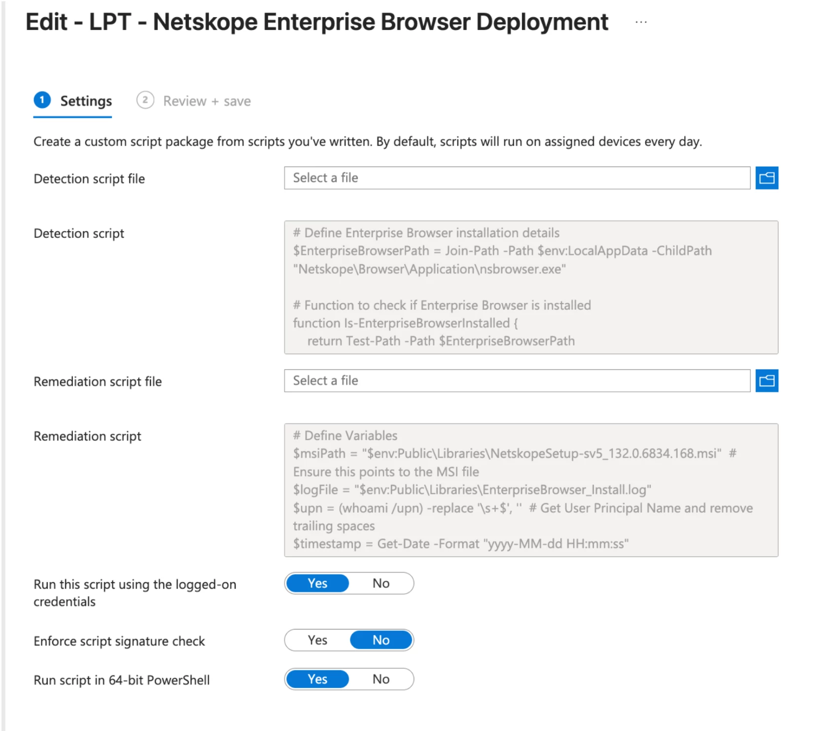 - Add your detection and Remediation script & set the script to run using the logged-on credentials and also set script to run in 64-bit