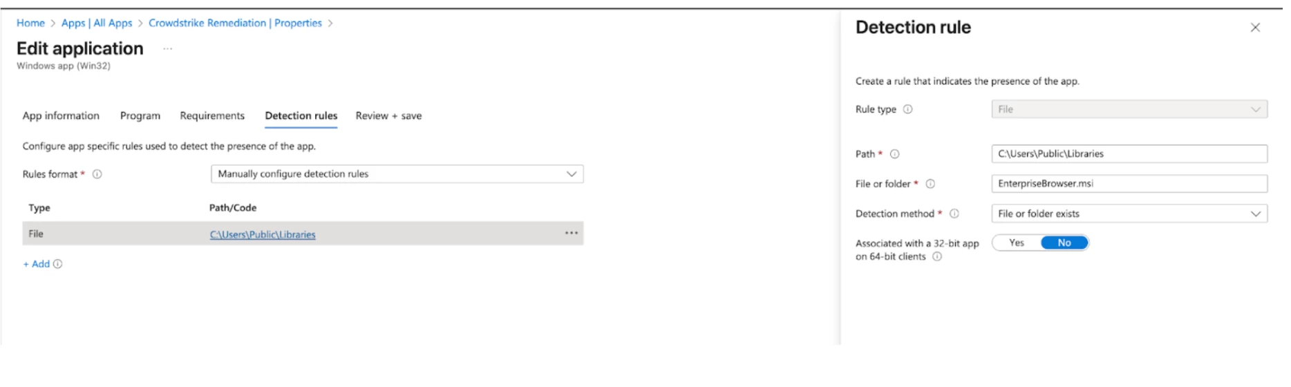- For the detection, you can set manual and map to the C drive public Libraries folder: C:\Users\Public\Libraries. In the file section, place EnterpriseBrowser.msi