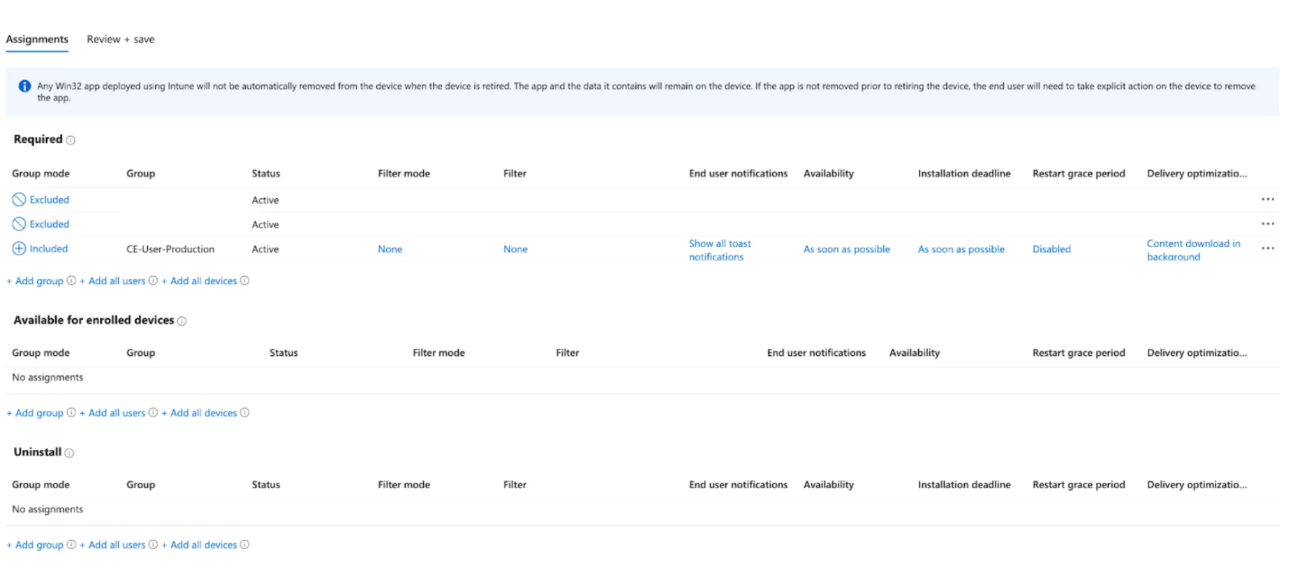 - Assign to your relevant scope or assignment group and then select complete and allow to deploy to your targeted fleet.