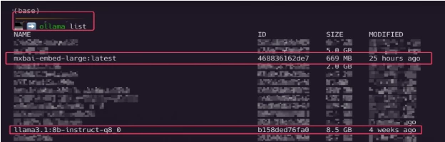 - Once the LLM Model and Embedder Model are downloaded use “ollama list” command to check the downloaded models as shown in screenshot below: