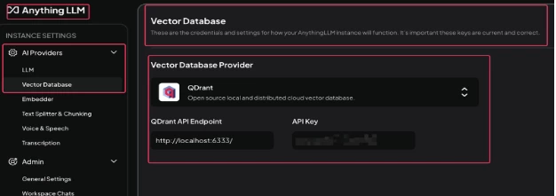 - In AnythingLLM GUI, goto Settings > Vector Database and select Vector Database Provider as Qdrant and point that to localhost as shown below: