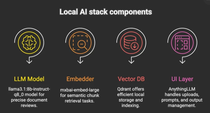 User Interface / Orchestration Layer | AnythingLLM — GUI application allowing you to select local LLMs, manage databases, and perform structured tasks for report review. | https://github.com/Mintplex-Labs/anything-llm |
