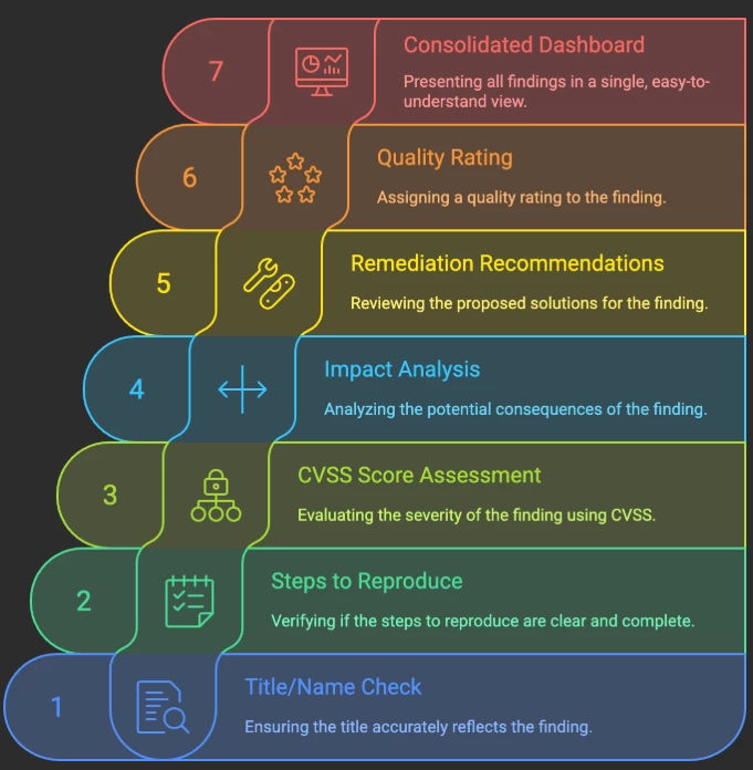 - Confirm if each finding includes supporting evidence (screenshots, logs, code snippets).