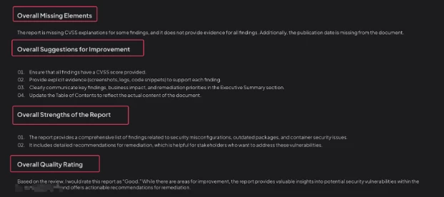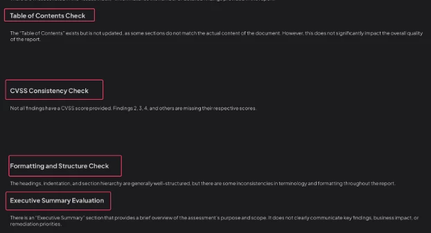 - Automated quality checks (scope, CVSS, evidence, Table of Contents consistency, etc.).