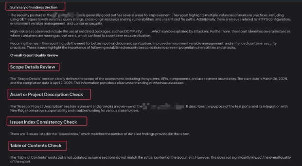 Sound familiar? You’re not alone. Manual report reviews are slow, error-prone, and rely heavily on the reviewer’s bandwidth and expertise. But what if we had a smart first-pass reviewer that flagged gaps, standardized structure, consistency in findings & recommendations and freed us to focus on the real contextual risk analysis?