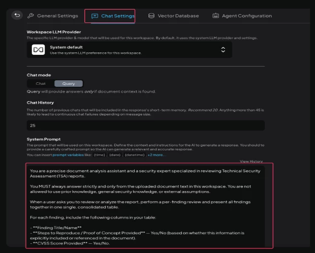 - In “Chat Settings” of the create workspace add the system prompt as shown below: