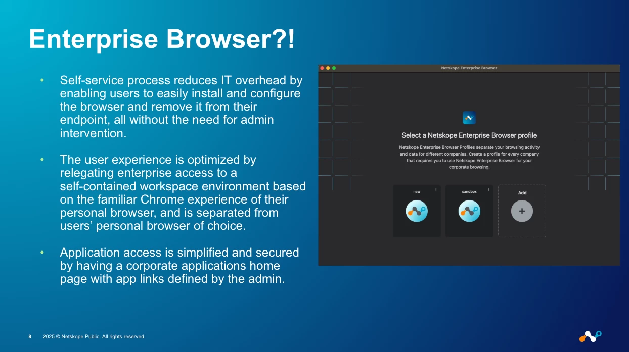 - For the Admin: You don't manage individual browsers. You create "Company Workspaces" in the Netskope UI. Here, you define the application links (SaaS and private) that users assigned to this workspace will see.