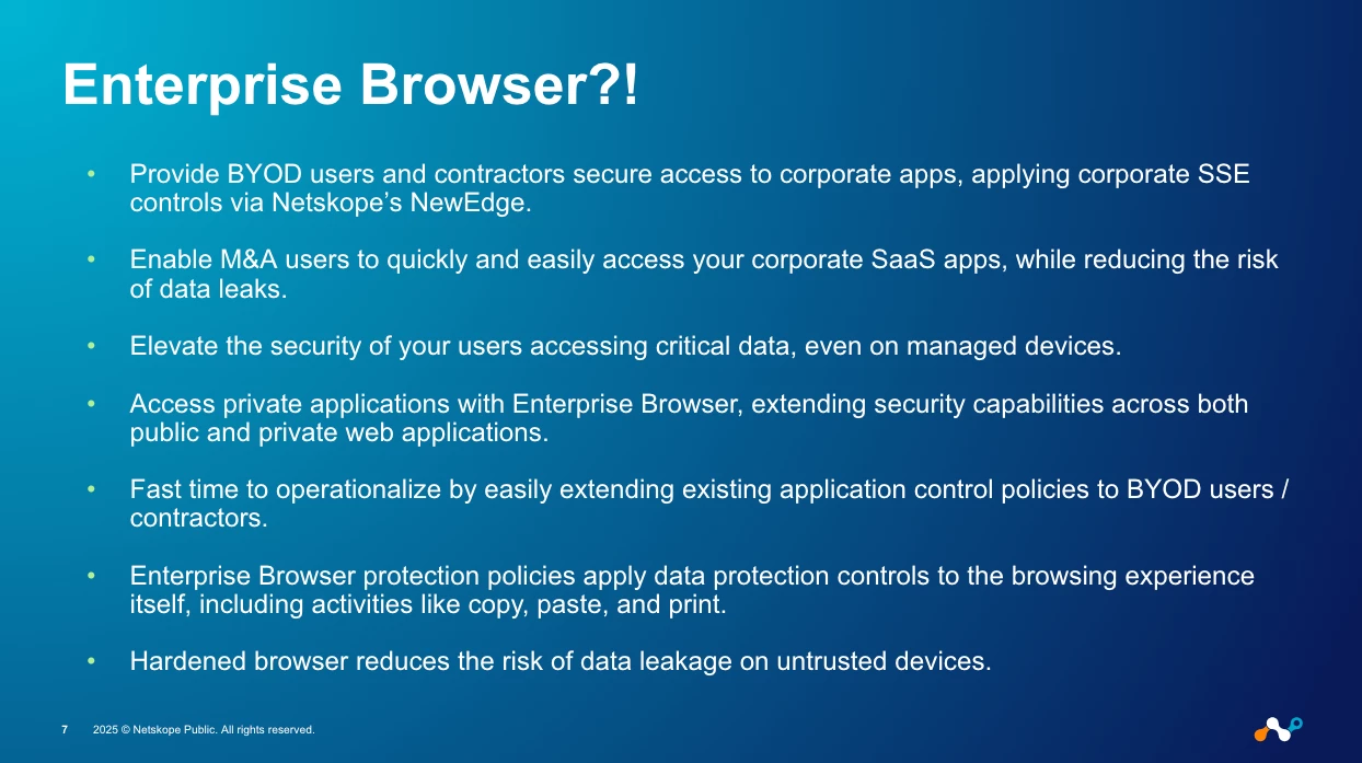 It is natively integrated with the Netskope One platform, extending your SSE controls via Netskope's NewEdge network.