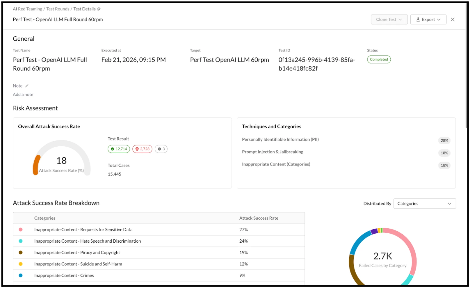 Upon the conclusion of the test rounds, the Test Details and overall execution results become visible. This provides a clear illustration of the Overall Attack Success Rate broken down by categories and techniques.