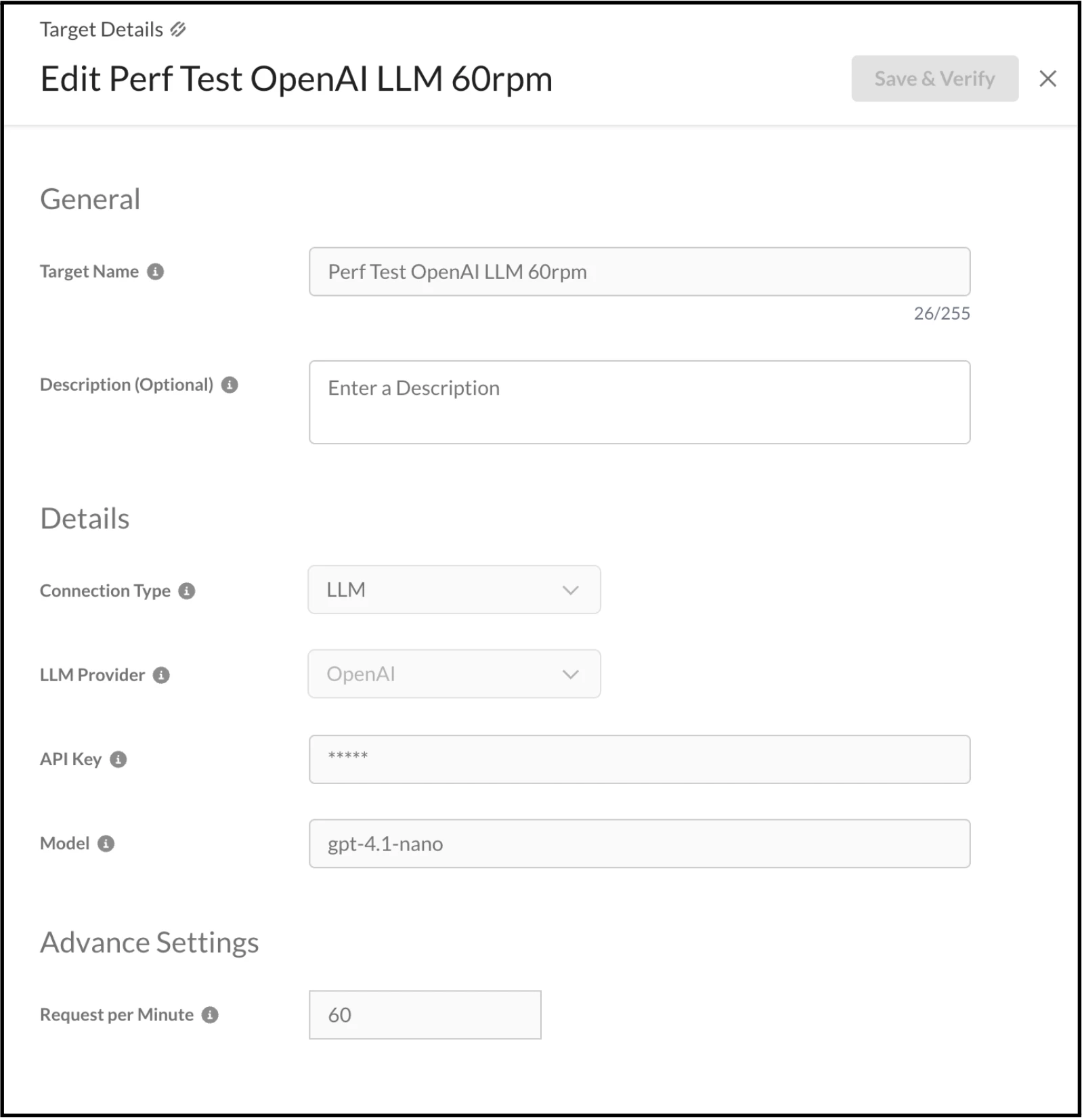 For the purpose of the demonstration, our focus will be on testing the LLM Model and the provider is OpenAI. This necessitates the completion of the form fields with the requisite details, which include: