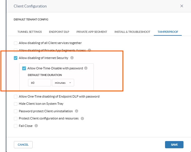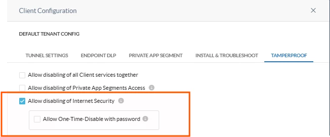 This option allows the user to disable the Internet Access tunnel only, without touching the Private Access tunnel. No authentication is required. This is the most targeted form of no-auth disablement , it leaves NPA connectivity intact while stopping web and SaaS traffic inspection.