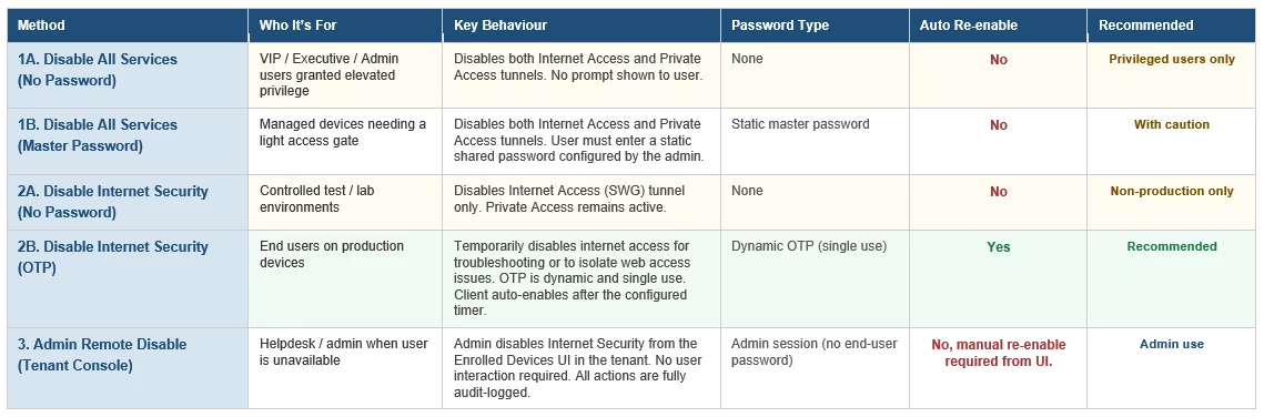 Use when you need to disable the Internet Access tunnel without requiring a password, and without disrupting Private Access connectivity. Since there is no authentication barrier, this option should be limited to controlled test or lab environments. Not recommended for production deployments.