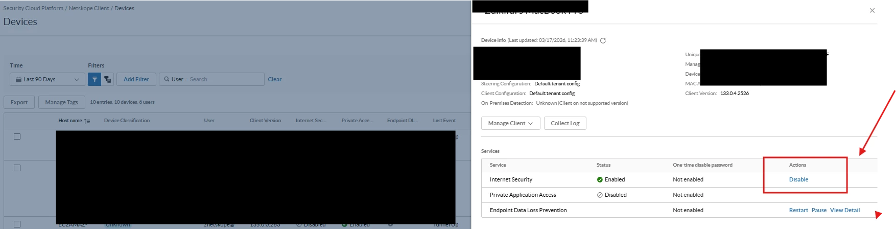 An administrator can disable the Internet Security service for any enrolled device directly from the Netskope tenant UI without requiring any action from the user on the endpoint. This is done from the Enrolled Devices page.